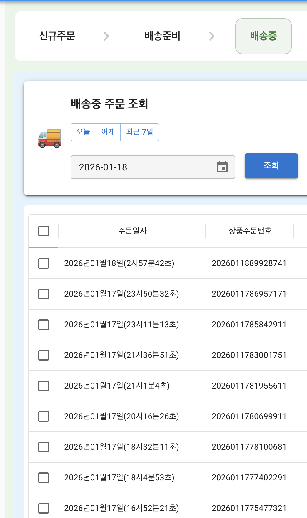 API로 네이버스토어쪽 반영 이후 배송중으로 넘어와서 처리된 데이터들이 보인다.