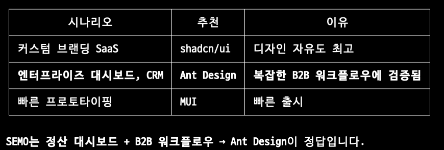 - MUI를 계속 쓸 수도 있고, Ant Design이나 shadcn/ui로 바꿀 수도 있음