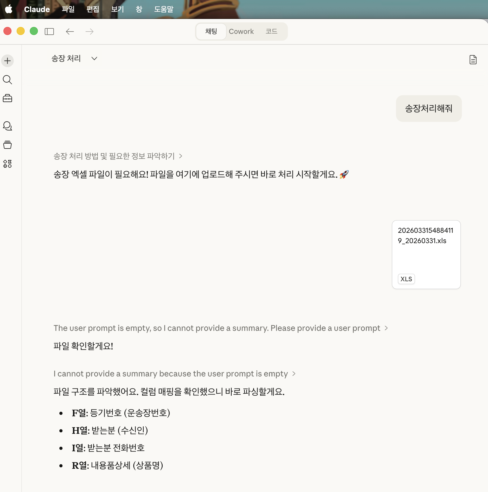 사용자: "이 엑셀로 송장처리해줘" + 파일 첨부