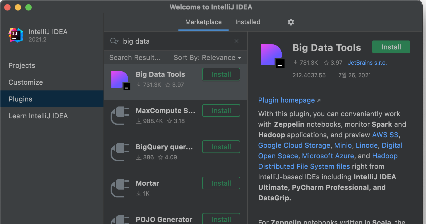 인스톨 이후 Plugins에서 Big Data Tools를 인스톨 해준다.