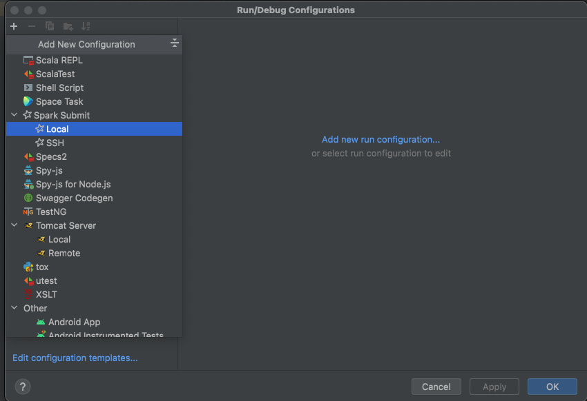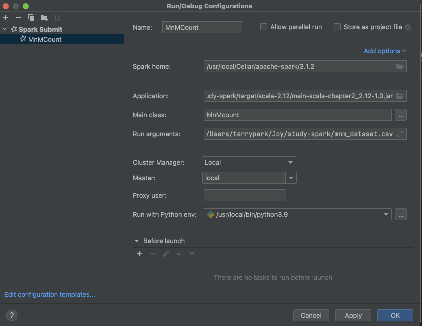 3. 소스 개발 이후 아래와 같이 Run/Debug Configurations를 설정 한다.(Spark-Submit을 하기 위해!)
