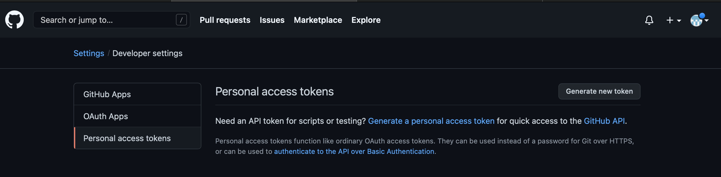 - Settings > Developer settings에 가면 Personal access tokens가 보인다.