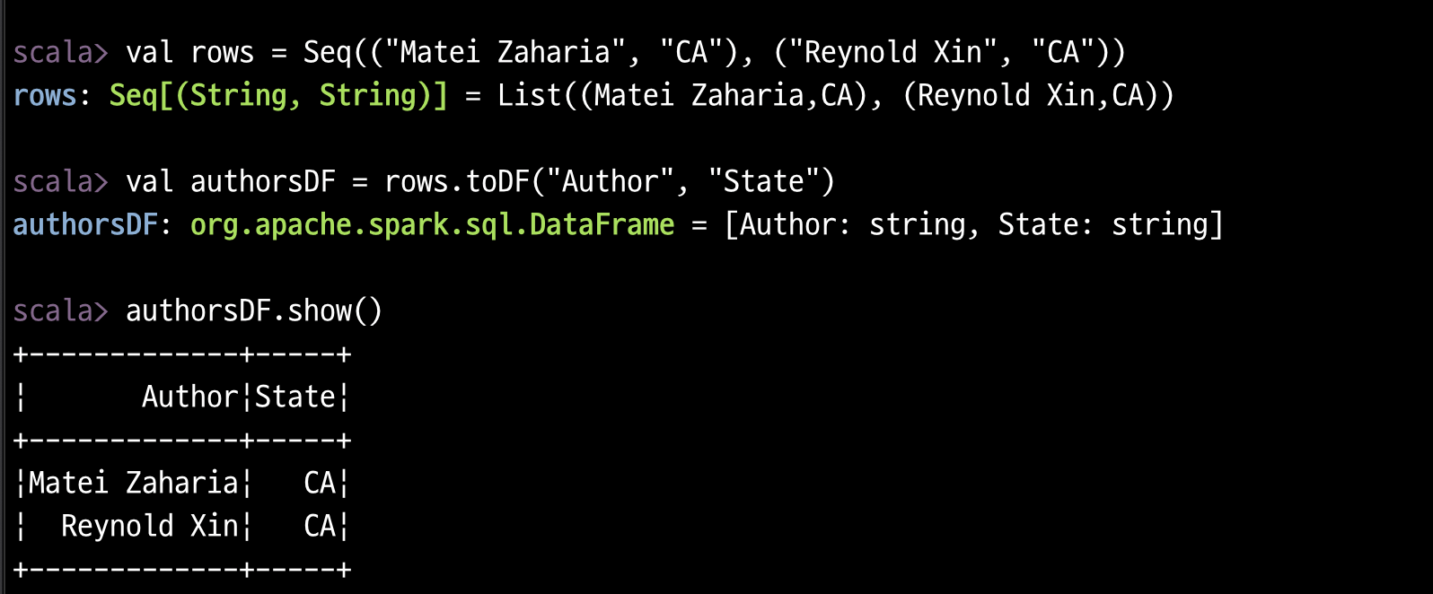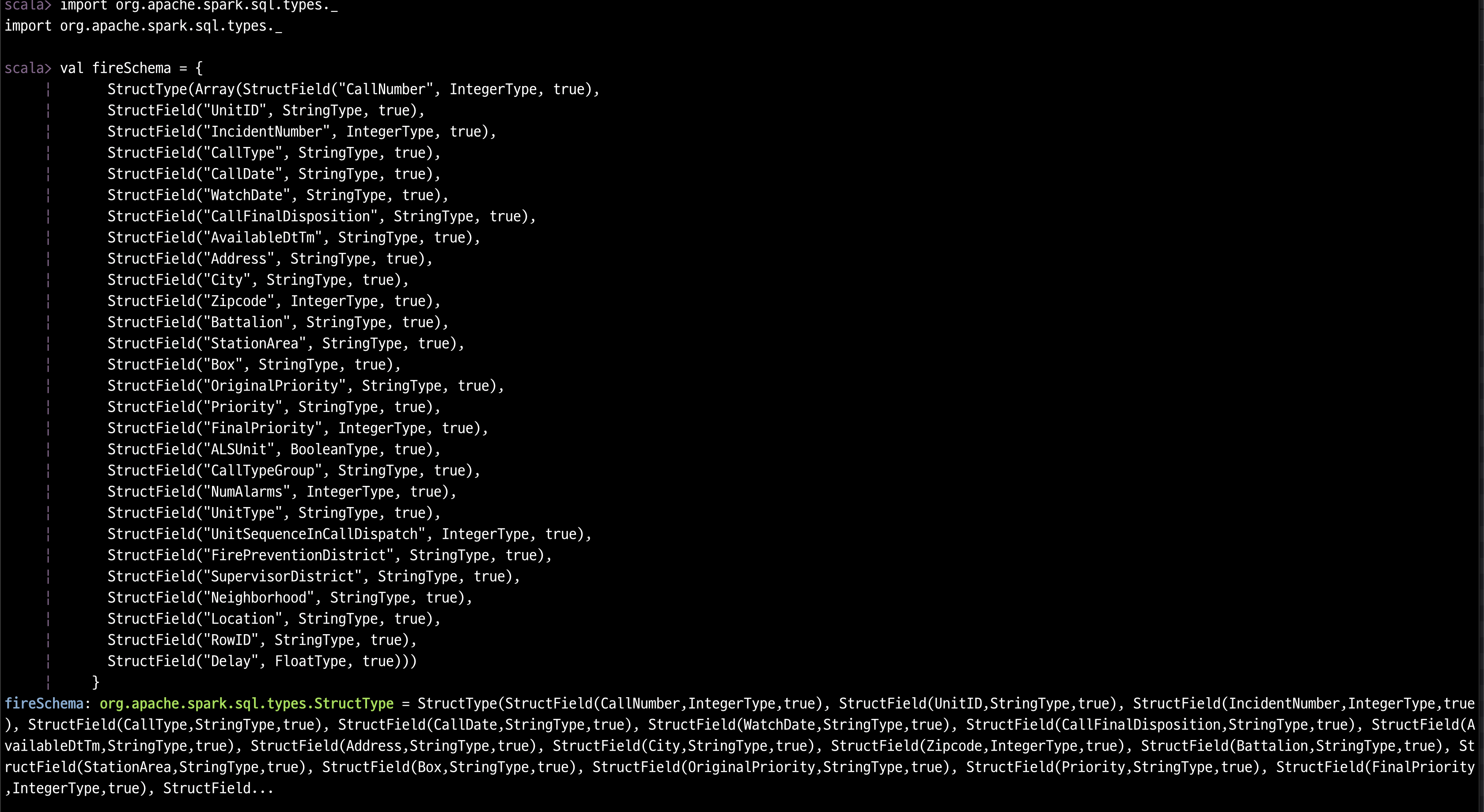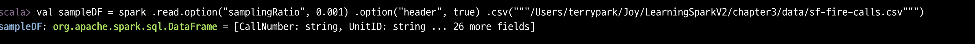 scala> val sf_fire_file ="/Users/terrypark/Joy/LearningSparkV2/chapter3/data/sf-fire-calls.csv"