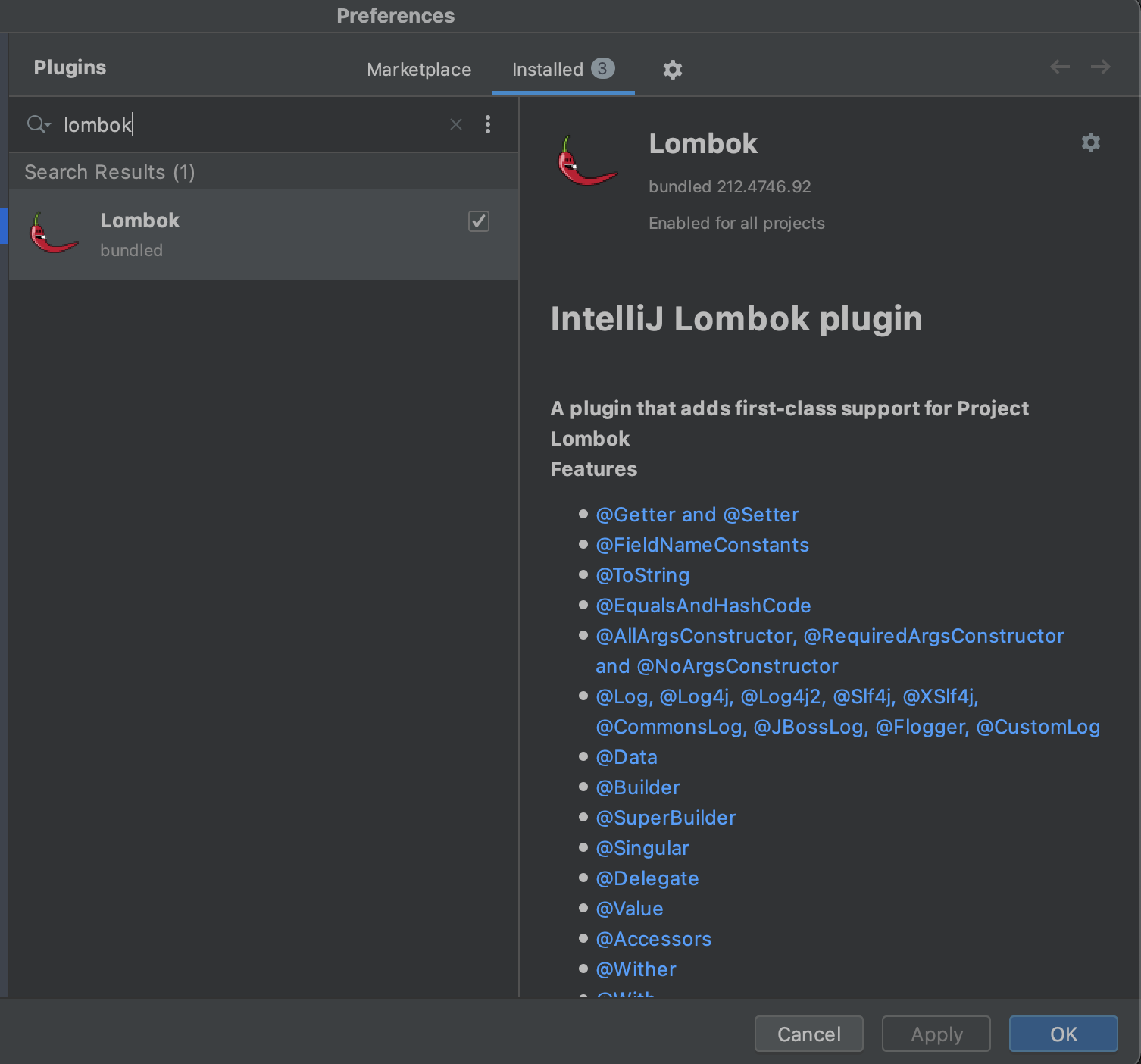 그리고나서 플러그인에서 lombok을 찾아서 셋팅 해줍니다.