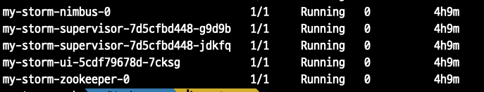 위의 pod에서 nimbus와 zookeeper는 statefulset이라 뒤에 번호가 hash이 아니다.