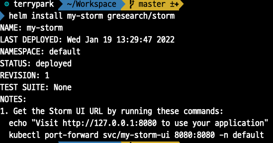 쿠버네티스의 패키지를 한번에 다 설치해주기 때문에 뭐가(storm, zookeepr, ui, service, pod등) 어떻게 뜨는지 알수 있을 것이다.