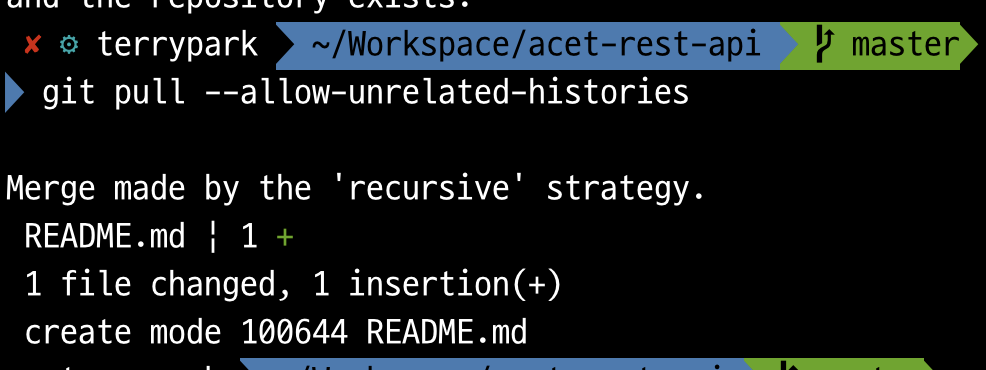 거절당했다...이유는 merge를 하는데 unrelated histories가 있다는 것이다.