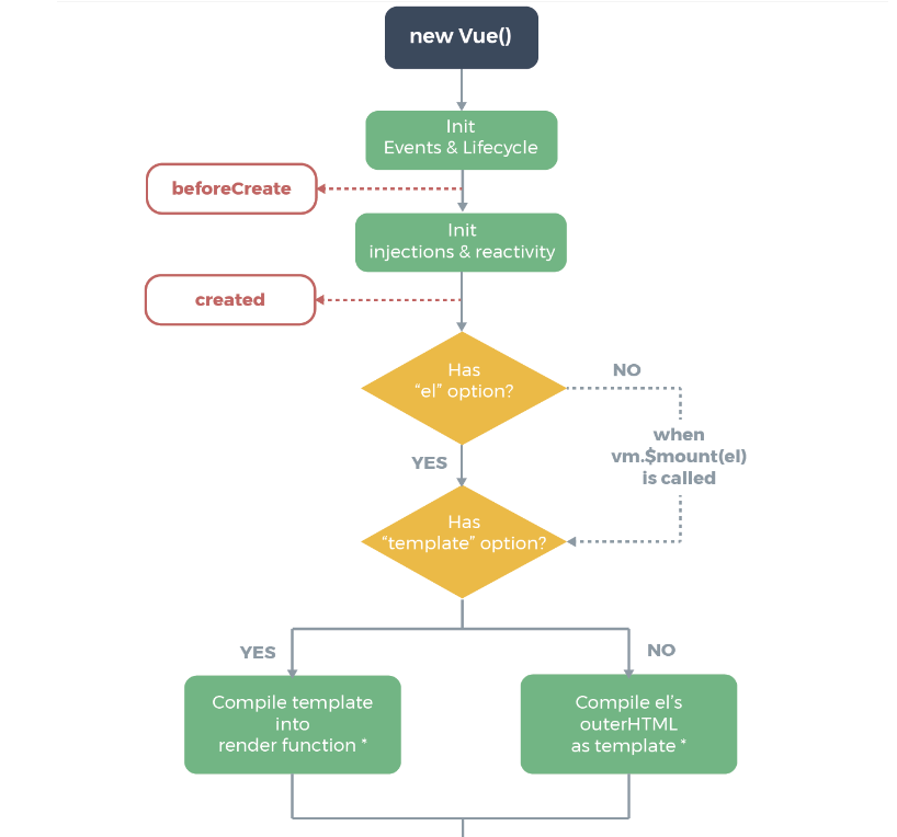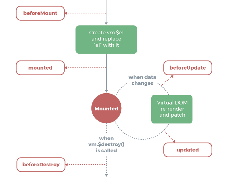 beforeMount() - <template> 태그를 렌더링 함수로 컴파일 합니다.