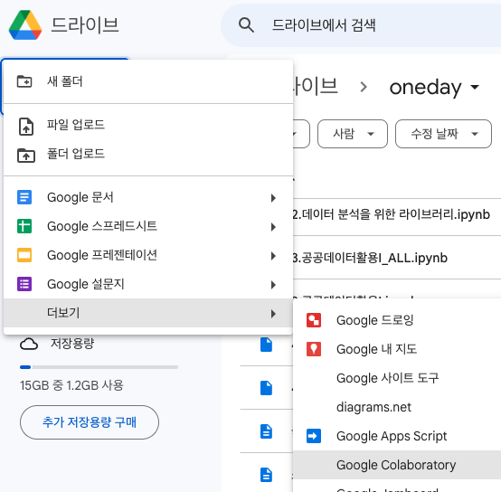 설치가 되면 더보기 > Google Colaboratory를 통해서 만들수가 있습니다.