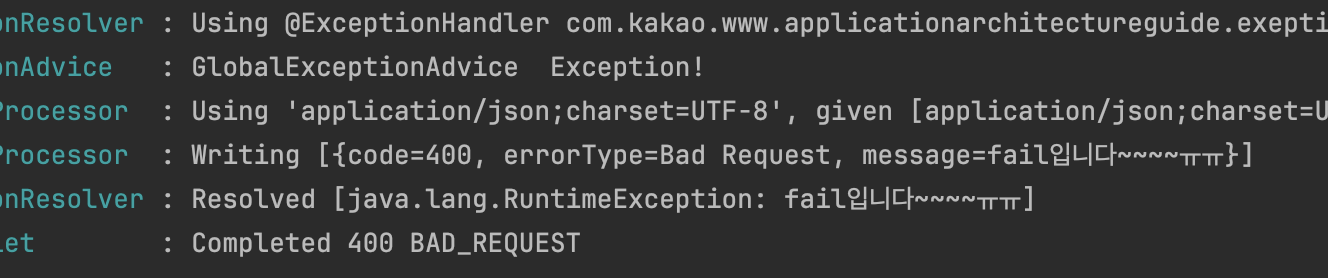 log를 살펴보면 GlobalExceptionAdvice Exception! 이라는 문구가 찍힙니다.