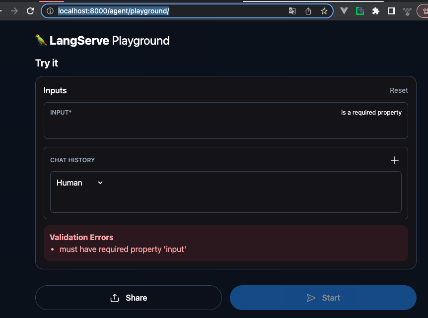 8000포트에 붙어서 /agent/playground로 접속해보면 아래와 같이 웹사이트가 하나 나옵니다!
